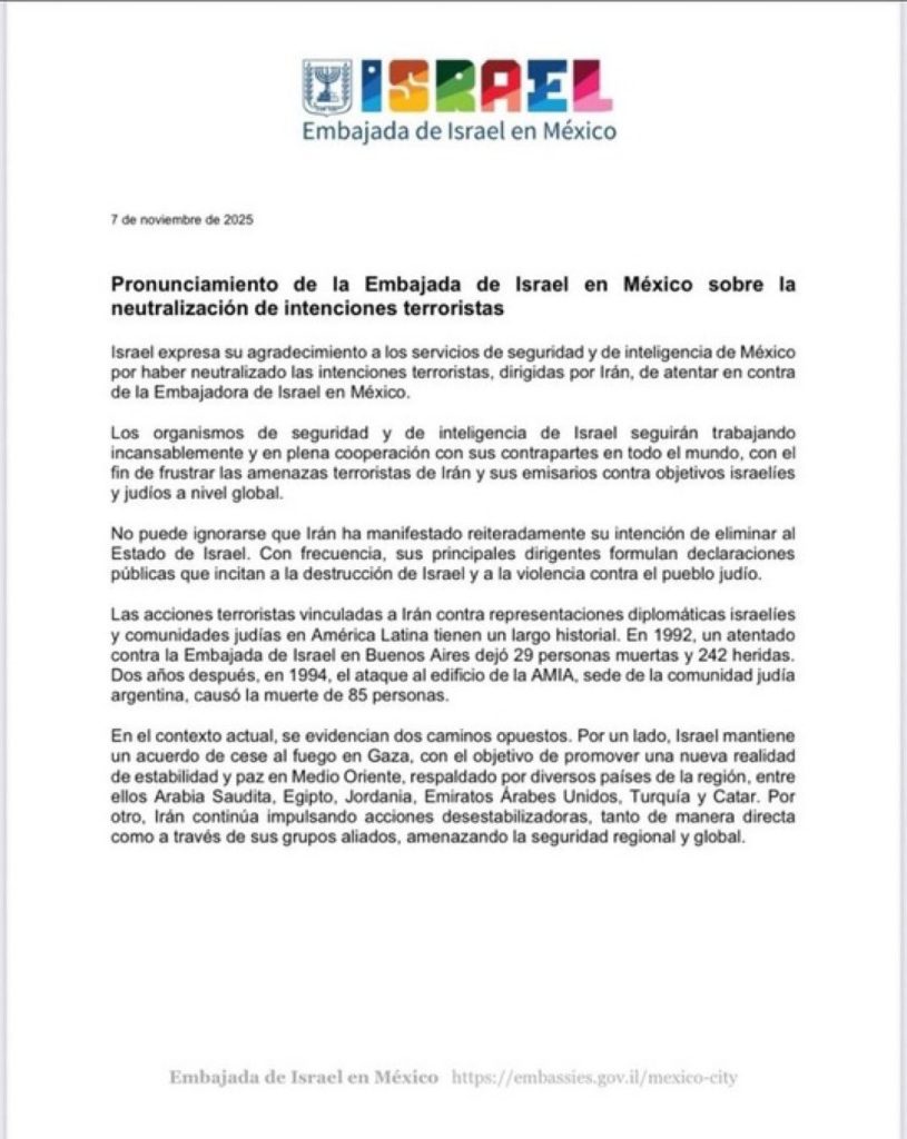 En un comunicado oficial, la representación diplomática reconoció la labor de los servicios de seguridad e inteligencia mexicanos por frustrar “las intenciones terroristas dirigidas por Irán” y reiteró su compromiso de cooperación con sus contrapartes en todo el mundo para “neutralizar las amenazas terroristas de Irán y sus emisarios contra objetivos israelíes y judíos a nivel global”.