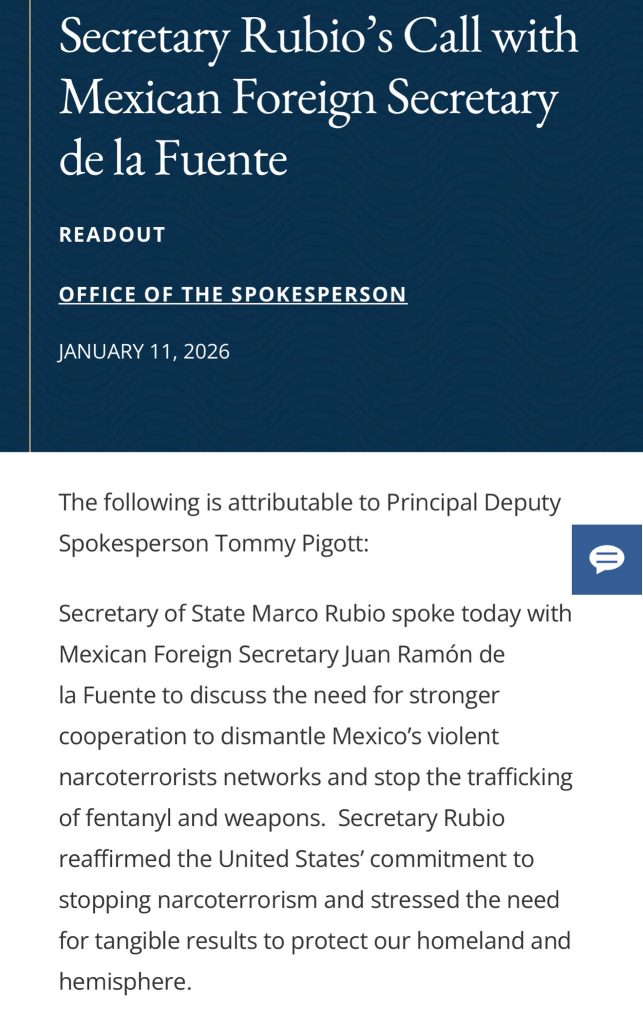 «Atendiendo las instrucciones de la presidenta Claudia Sheinbaum, hoy el canciller Juan Ramón de la Fuente sostuvo una llamada con el secretario de Estado Marco Rubio, para dar seguimiento al Programa de Cooperación de Seguridad Fronteriza y Aplicación de la Ley, bajo los principios de respeto irrestricto a la soberanía e integridad territorial, responsabilidad compartida, confianza mutua y colaboración sin subordinación.
