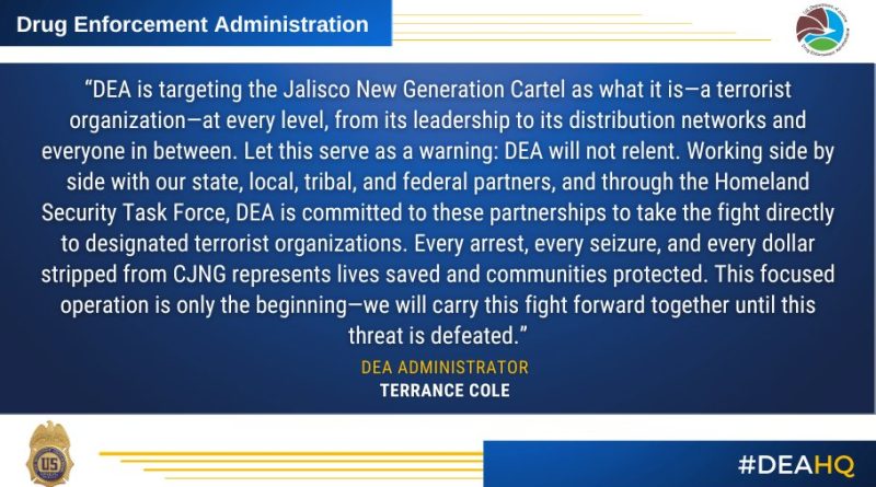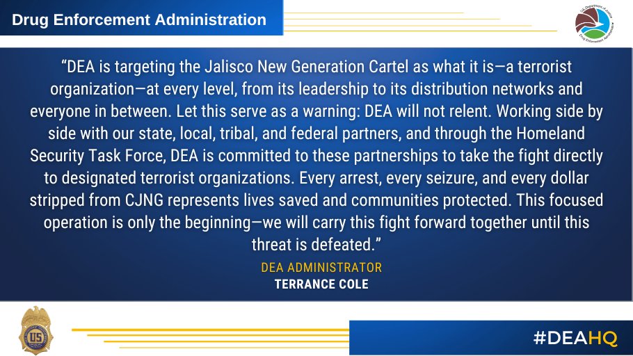 “La DEA está atacando al Cártel Jalisco Nueva Generación como lo que es: una organización terrorista, en todos los niveles, desde sus líderes hasta sus redes de distribución. Cada arresto, cada incautación y cada dólar confiscado al CJNG representa vidas salvadas y comunidades protegidas. Esta operación enfocada es solo el comienzo”, declaró.