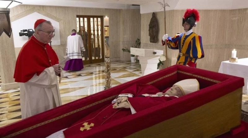 El ataúd del Pontífice está dispuesto en la Capilla de Santa Marta. El Papa Francisco está expuesto en un simple ataúd de madera abierta sin el catafalco, vestido con la mitra, la sotana blanca, la casulla roja y el palio blanco. En sus manos sostiene el rosario.