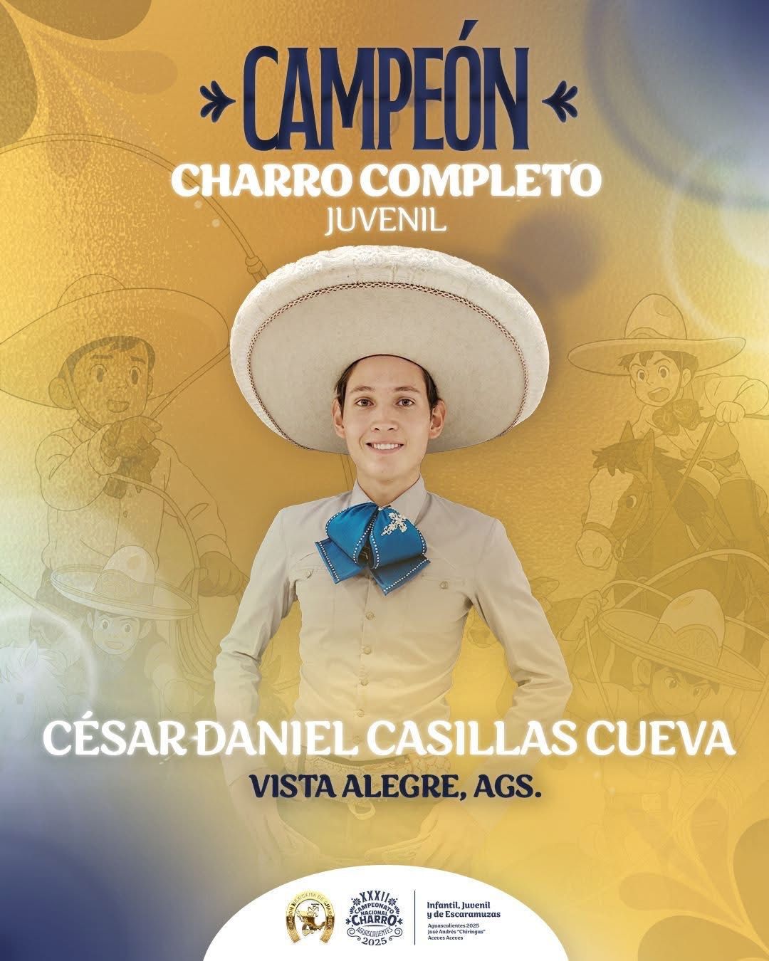 Felicidades a César Daniel Casillas Cueva, Campeón Charro Completo en la categoría Juvenil, representando con orgullo a Vista Alegre, Aguascalientes. 🏆
