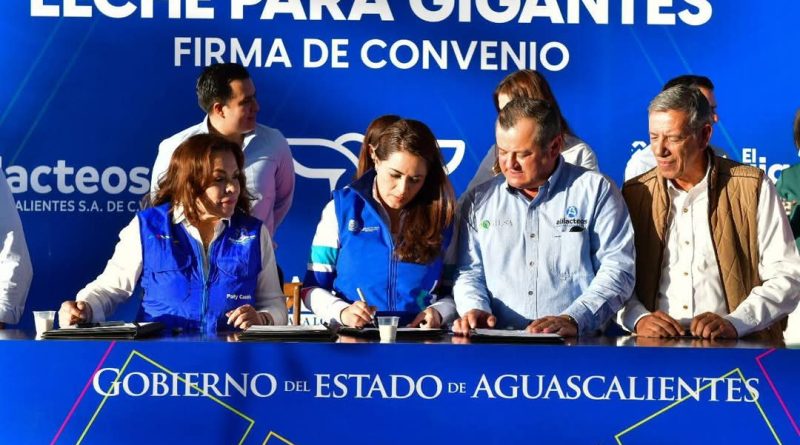 La gobernadora Tere Jiménez encabezó la firma del convenio para la producción de “Alileche, para los futuros gigantes”, con lo que se apoya a los lecheros para la venta de su producto y a las familias de Aguascalientes que ahora podrán adquirir leche de calidad a un precio accesible.