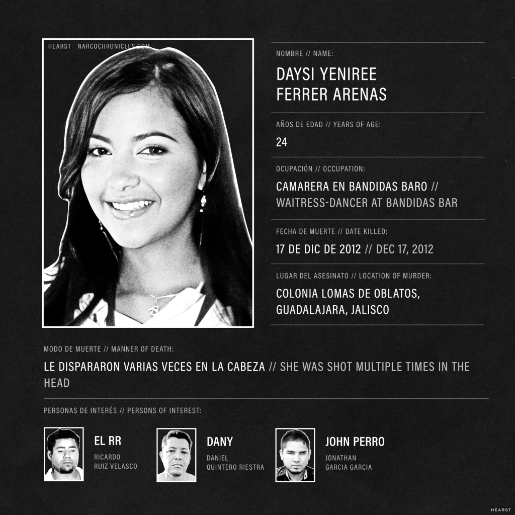 El 15 de diciembre de 2012, Daysi dejó de responder a los mensajes de su madre, Íngrid Arenas. Días antes había contado que un “hombre poderoso” la acosaba. Tres días después, su cuerpo fue hallado con heridas de bala en la cabeza, cerca de un canal pluvial en Guadalajara.
