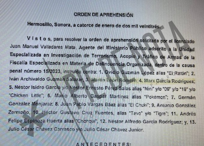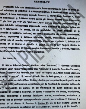La resolución judicial señala como probables responsables del delito de delincuencia organizada, en su modalidad de tráfico y fabricación de armas, a una red encabezada por los hijos de Joaquín “El Chapo” Guzmán y operadores clave del Cártel de Sinaloa, como Mario Alberto Gaspar Martínez, alias “Pokémon”, y Juan Pablo Vargas Báez, alias “El Chuki”.