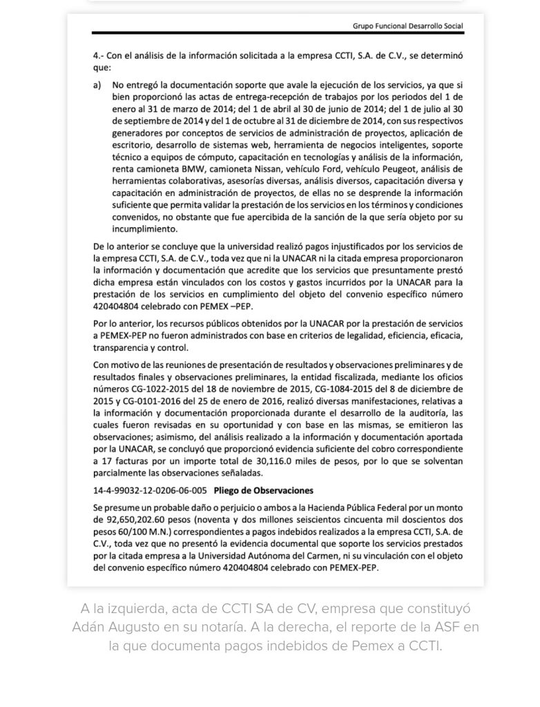 Entre las nuevas firmas apareció CCTI S.A. de C.V., constituida el 28 de mayo de 2004 en la notaría de Adán Augusto. Aunque no está incluida en la lista de factureras del SAT, la ASF detectó que recibió 92 millones 650 mil pesos de Pemex a través de la Universidad Autónoma del Carmen.