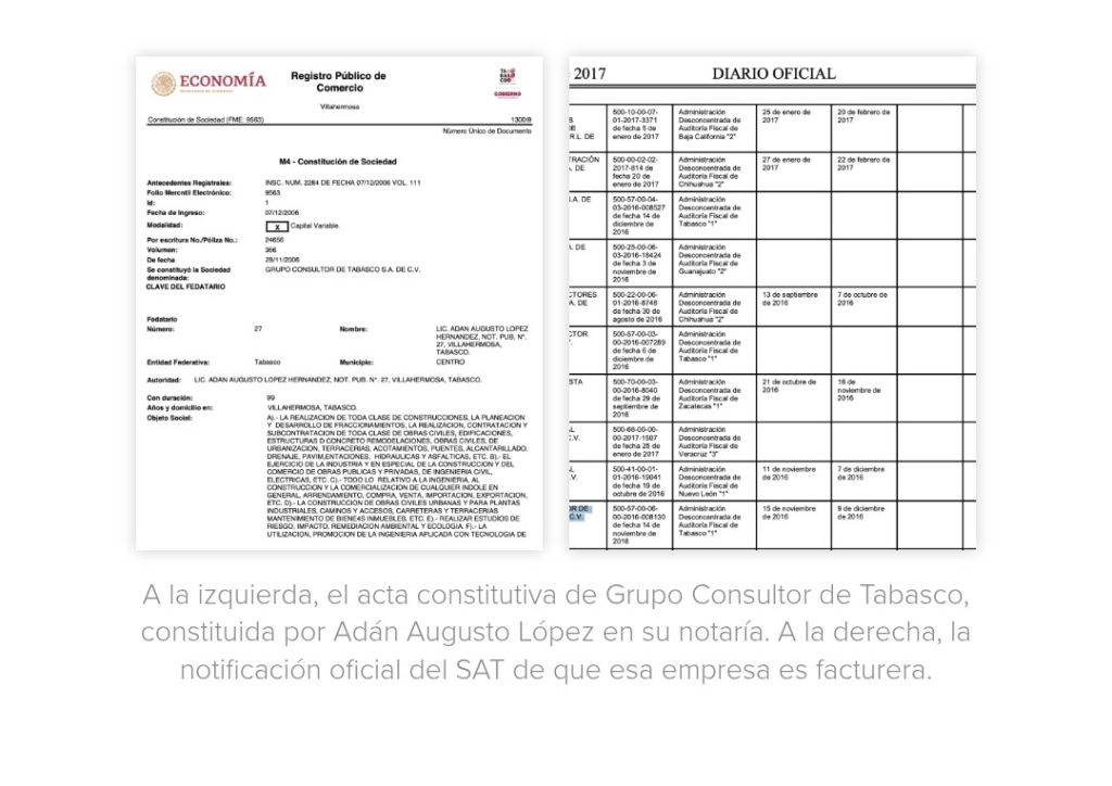 Entre las empresas constituidas por Adán Augusto se encuentra Grupo Consultor de Tabasco S.A. de C.V., incluida por el SAT en julio de 2017 en su lista definitiva de factureras.