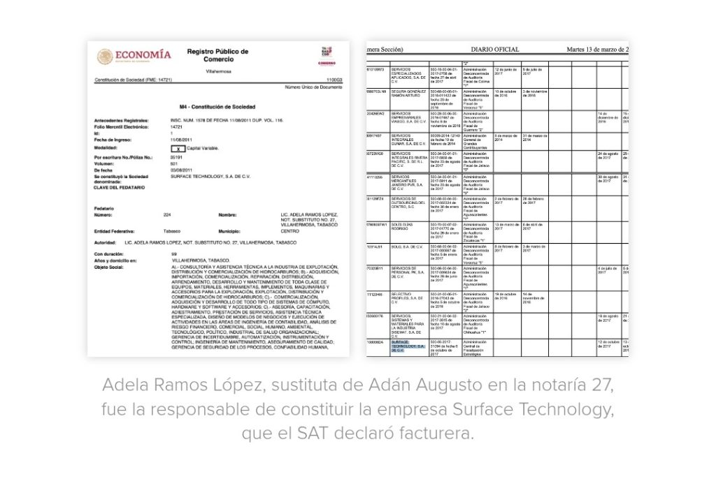 Una de ellas fue Surface Technology, creada el 3 de agosto de 2011 en la notaría de Adán Augusto con prestanombres, según comprobó la investigación.