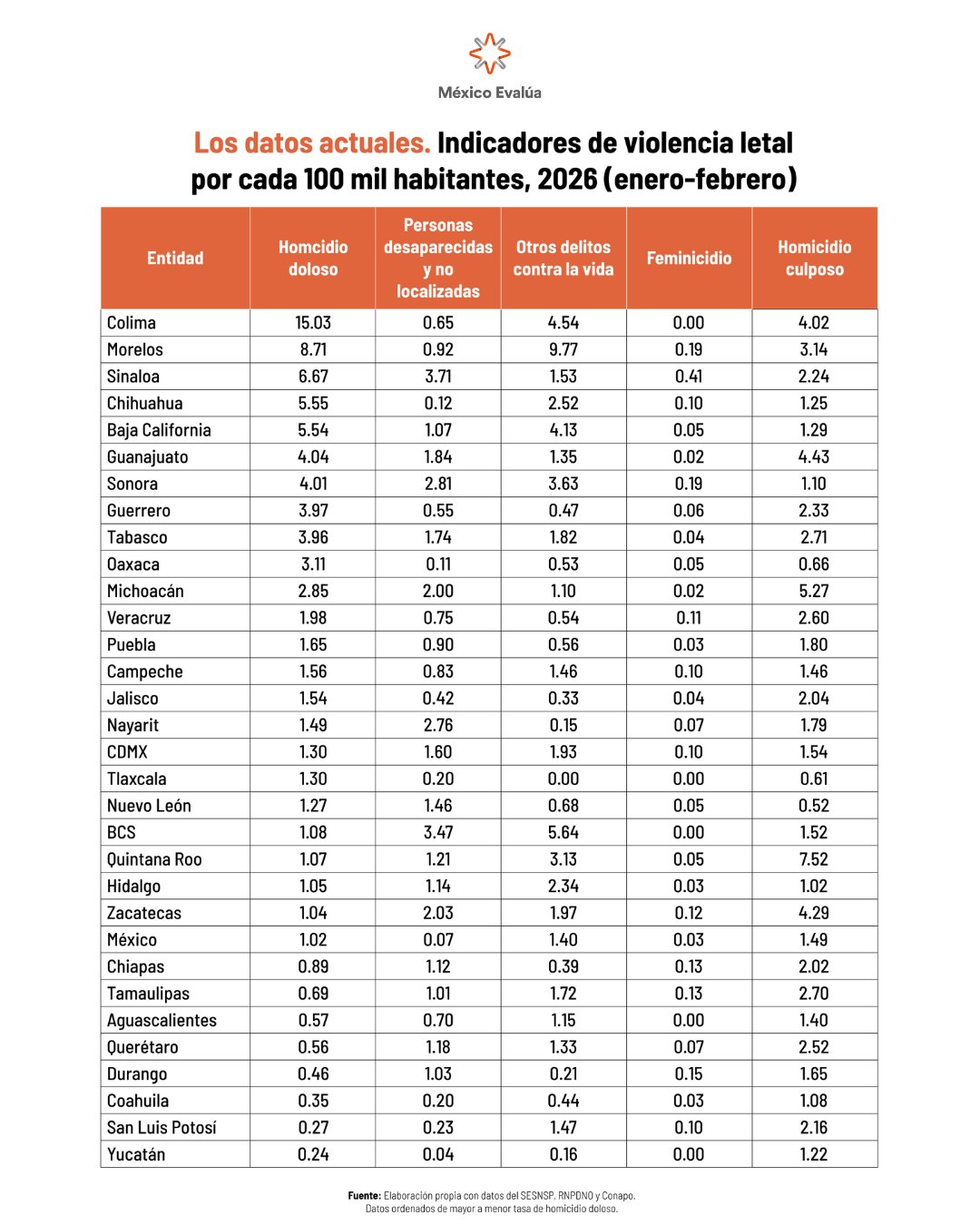 De acuerdo con el informe “Indicadores de violencia letal por cada 100 mil habitantes (enero-febrero 2026)”, Colima registró una tasa de 15.03 homicidios dolosos, muy por encima del resto del país. Le siguen Morelos con 8.71 y Sinaloa con 6.67, consolidándose como las entidades con mayor incidencia en este delito.