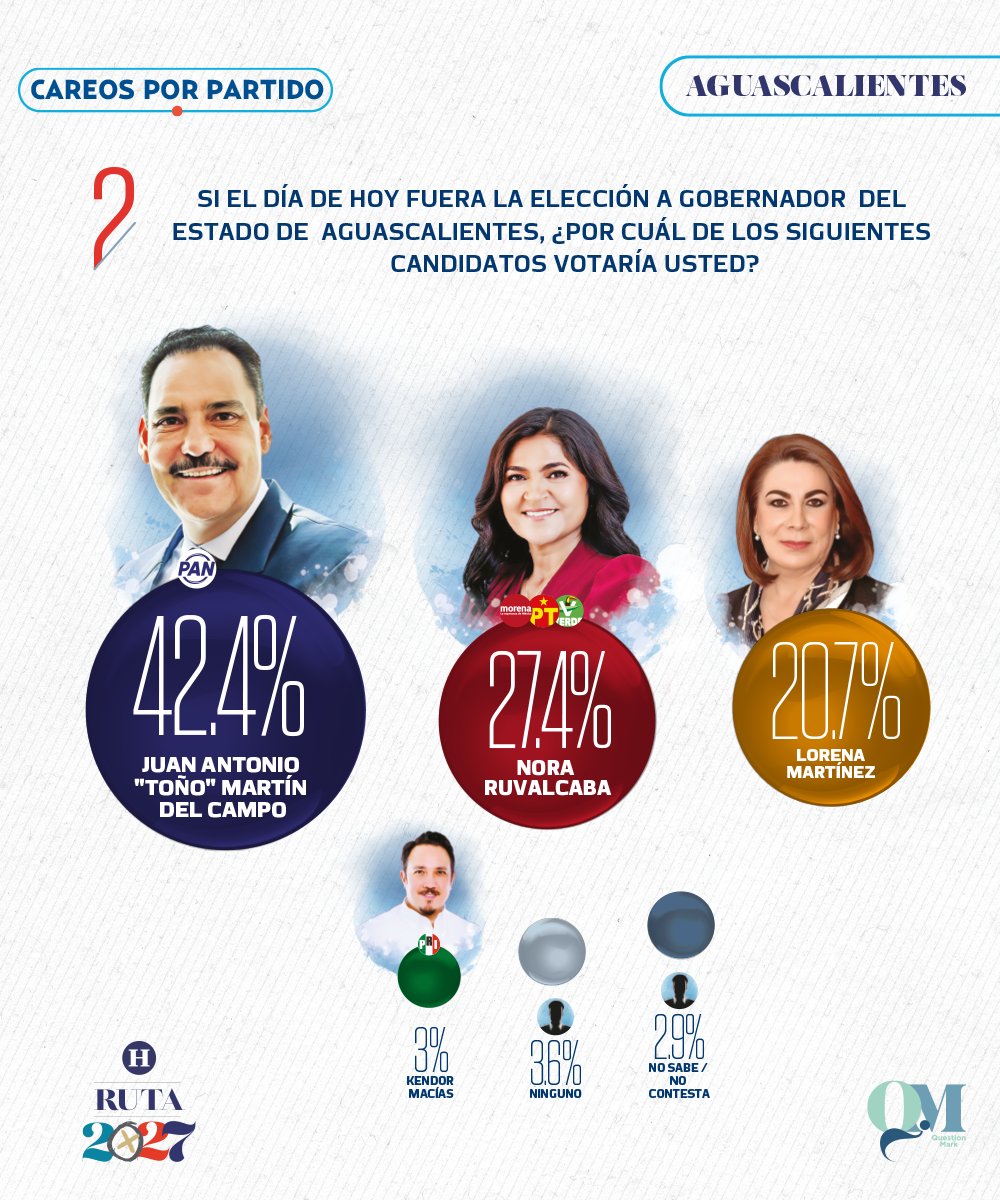 Pese a la abierta campaña de Morena, el senador panista Juan Antonio “Toño” Martín del Campo mantiene una ventaja holgada rumbo a la gubernatura de Aguascalientes, de acuerdo con la más reciente encuesta de QM Estudios de Opinión en alianza con Heraldo Media Group. El PAN sigue marcando el ritmo electoral en este estado, donde Morena no logra convencer y los demás partidos apenas sobreviven en las mediciones.