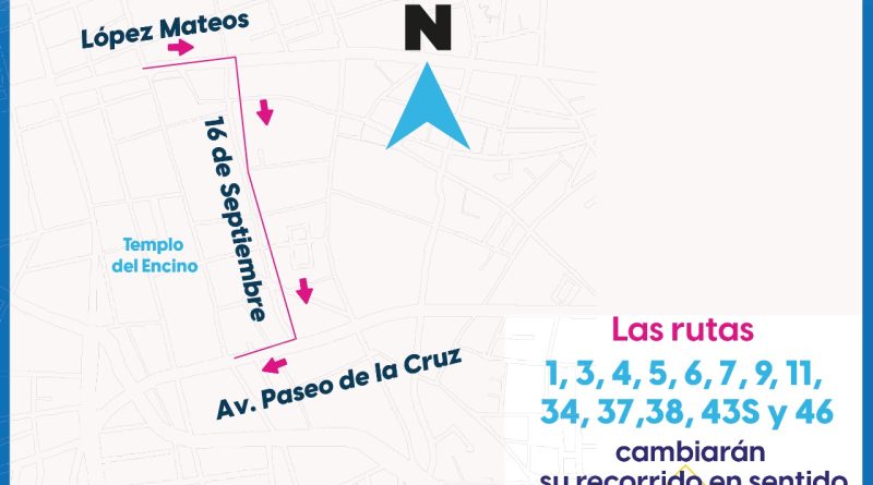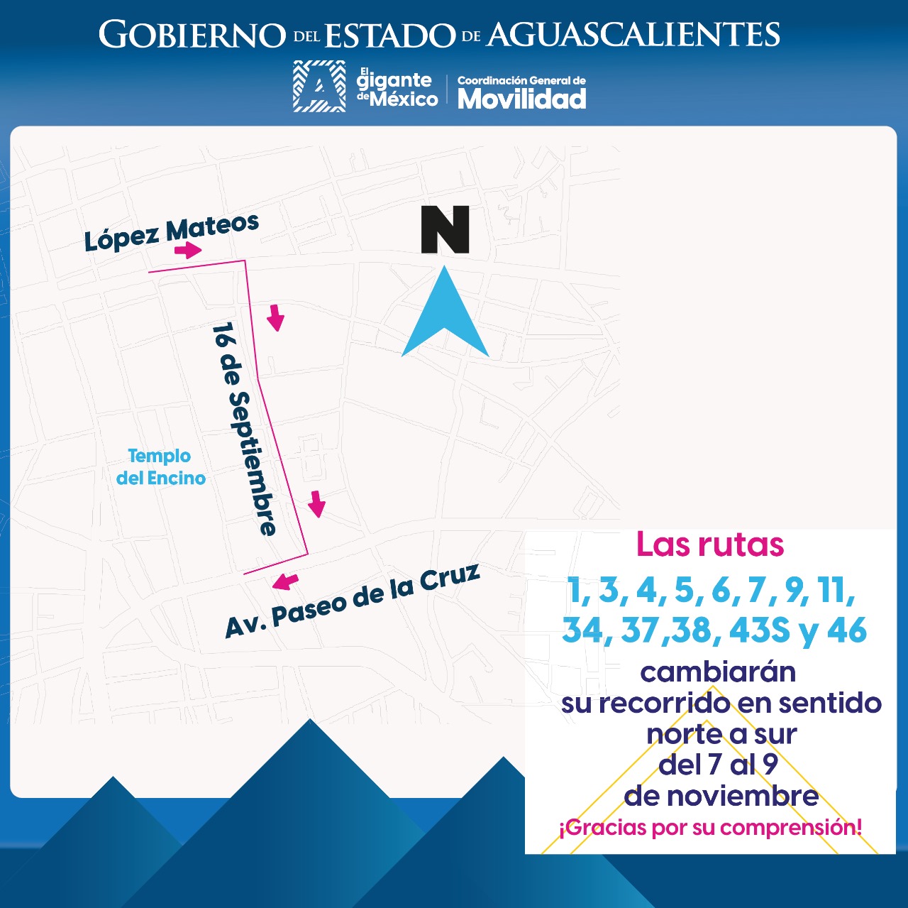 📅 Del viernes 7 al domingo 9 de noviembre, las rutas 1, 3, 4, 5, 6, 7, 9, 11, 34, 37, 38, 43 Sur y 46 circularán de norte a sur por la calle 16 de Septiembre, a partir de las 13:00 horas del viernes.