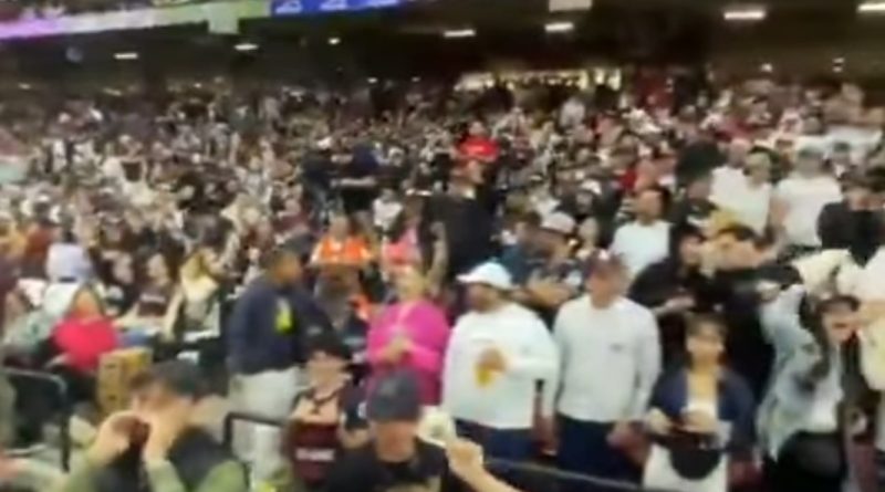 _El estadio de Los Tomateros retumbó cuando el gobernador apareció en las pantallas, desatando un coro de “¡Fuera Rocha!” entre los asistentes.