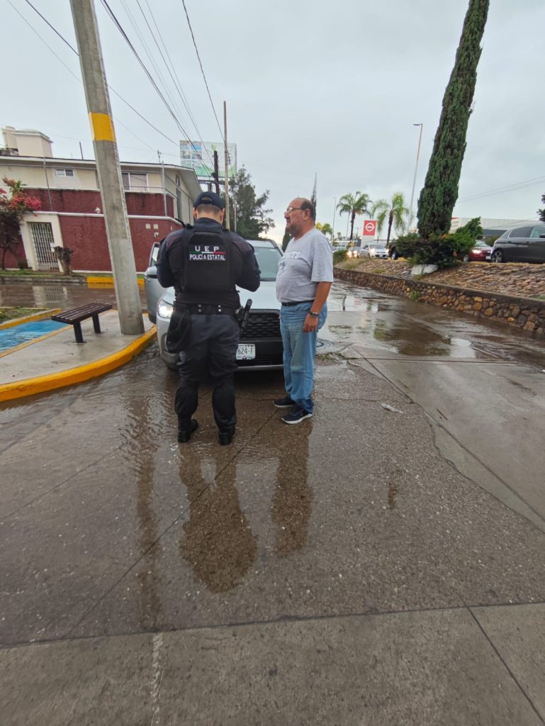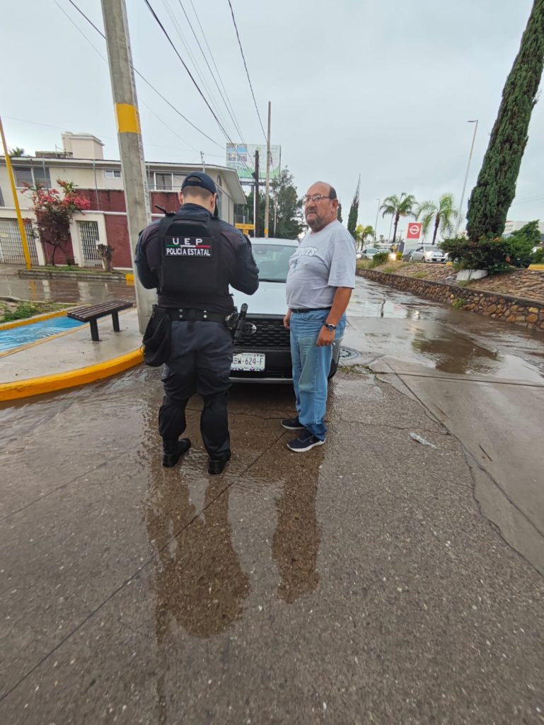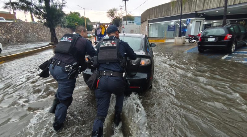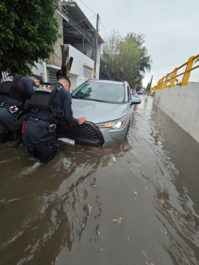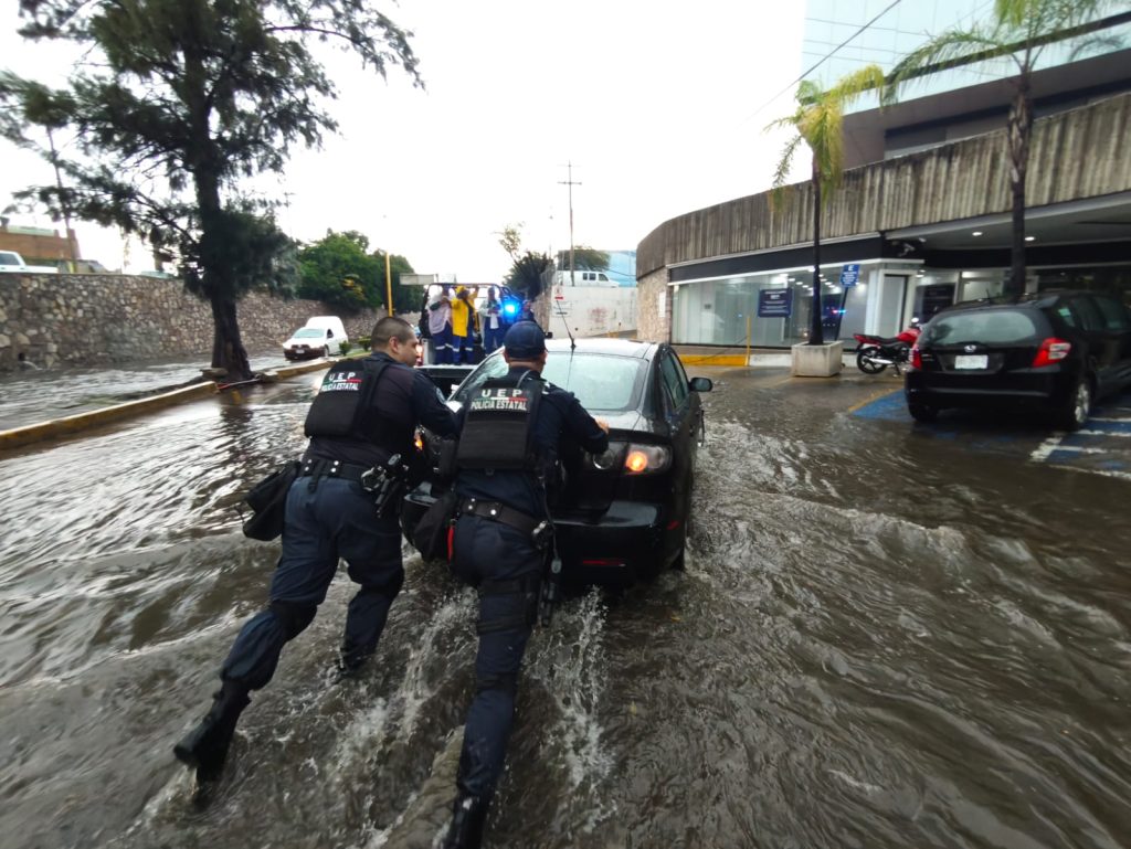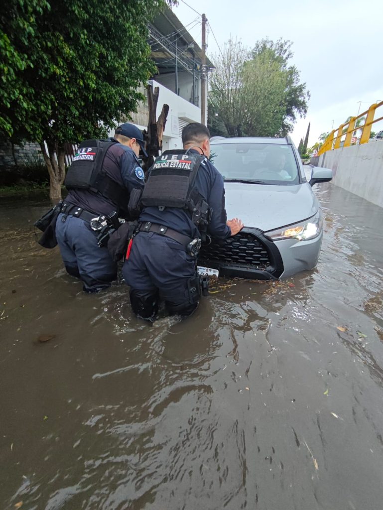 En una primera intervención, policías estatales auxiliaron al conductor de un automóvil que se quedó varado sobre avenida Adolfo López Mateos, debido a una falla mecánica ocasionada por el agua acumulada. Los oficiales empujaron la unidad y la colocaron en un lugar seguro.