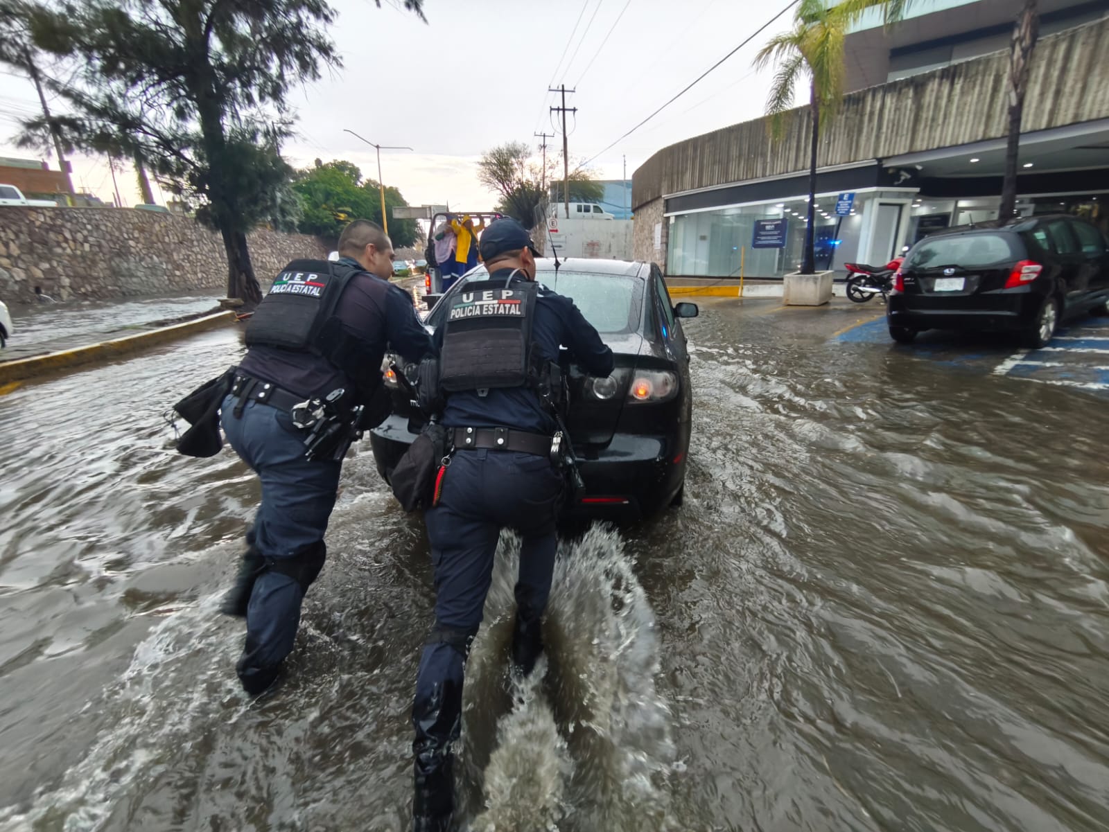 Elementos de la Policía Estatal y del H. Cuerpo de Bomberos del Estado brindaron apoyo este sábado a cerca de 20 personas que quedaron varadas tras las fuertes lluvias registradas en la capital y en el municipio de Jesús María. En total, fueron rescatados siete vehículos atrapados en encharcamientos.