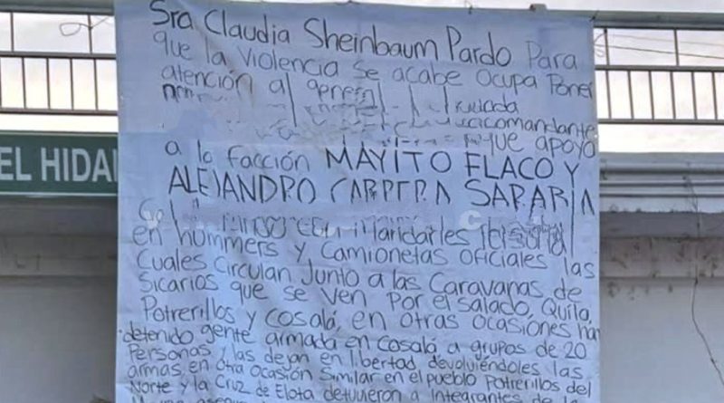 Inntegrantes del grupo criminal «Los Chapitos» colocaron este día diversas narcomantas en puntos estratégicos de la ciudad de Culiacán, dirigidas a la presidenta de México Claudia Sheinbaum Pardo. En ellas acusan al general Porfirio Fuentes Vélez, comandante de la Novena Zona Militar, de brindar protección a una facción rival del Cártel de Sinaloa, encabezada por Mayito Flaco (Ismael Zambada Sicairos) y Alejandro Cabrera Sarabia.