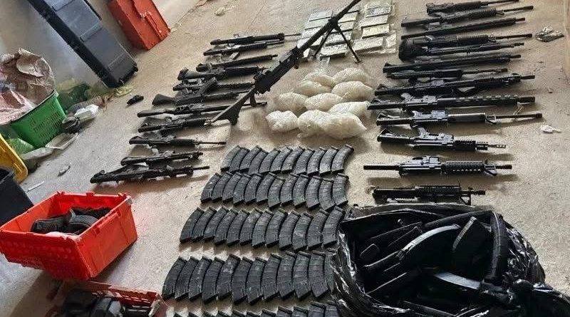 Tras el cateo de la casa, fueron encontrados 21 rifles de asalto, una ametralladora calibre .308, 889 cargadores de diversos calibres, 500 cartuchos, 10 chalecos tácticos, 14 teléfonos, 3 radios, así como 17 kilos de cocaína, 10 kilos de metanfetaminas y 100 gramos de marihuana.