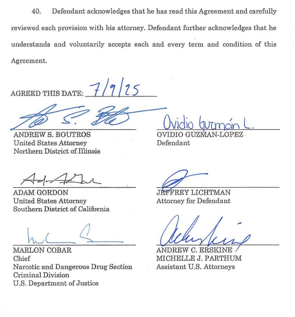 En la sección final del documento, Ovidio Guzmán reconoce explícitamente que ha leído, comprendido y aceptado cada uno de los términos del acuerdo, con asesoría de su abogado, Jeffrey Lichtman. La firma se realizó el 9 de julio de 2025 y también fue rubricada por fiscales federales de Illinois, California y funcionarios del Departamento de Justicia.