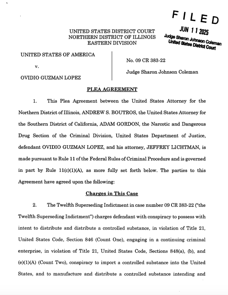 El acuerdo, presentado ante la jueza Sharon Johnson Coleman en la Corte del Distrito Norte de Illinois, forma parte del caso 09 CR 383-22 y responde a la duodécima acusación federal en su contra. Guzmán se declaró culpable de múltiples cargos que incluyen:
