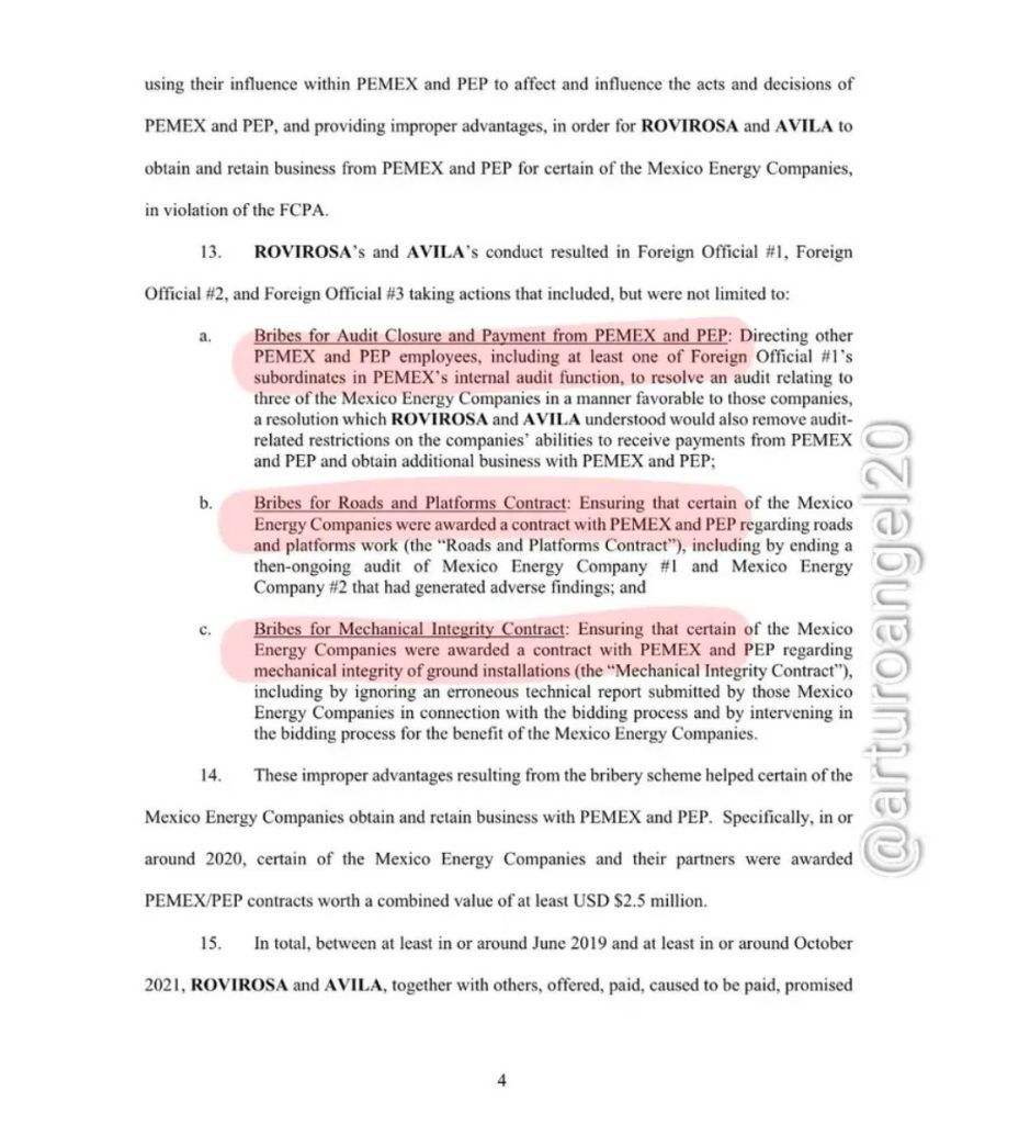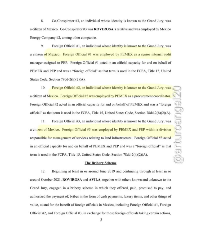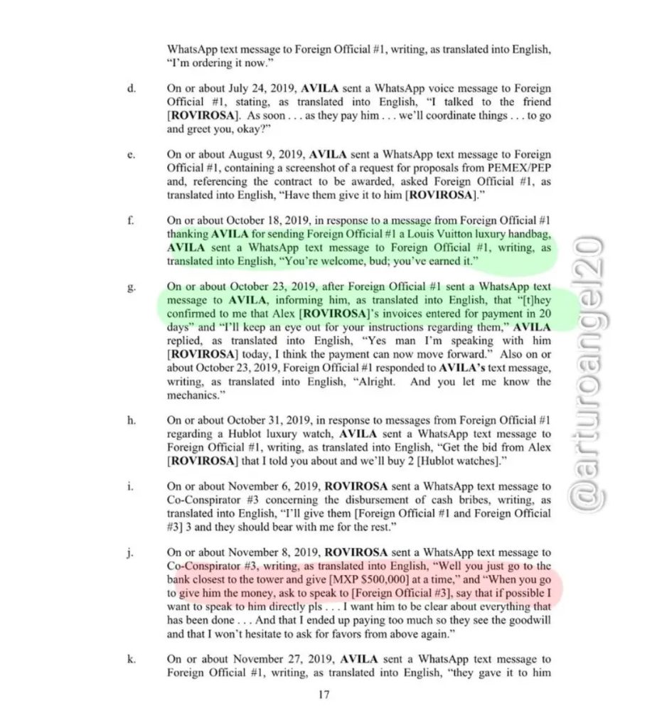 “Desde al menos junio de 2019 y hasta octubre de 2021, Rovirosa y Ávila, junto con otras personas, participaron en un esquema de sobornos en efectivo, artículos de lujo y otras dádivas, en beneficio de funcionarios de Pemex”, indica la acusación.
