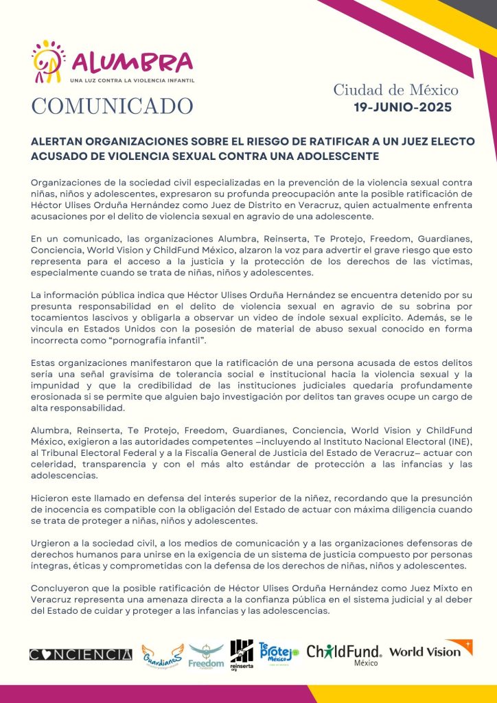 Las organizaciones exigieron al Instituto Nacional Electoral (INE), al Tribunal Electoral del Poder Judicial de la Federación y a la Fiscalía General del Estado de Veracruz abstenerse de entregar constancia de mayoría o ratificar a Orduña Hernández, al considerar que hacerlo enviaría un mensaje devastador: que incluso quienes enfrentan acusaciones por delitos sexuales contra menores pueden ocupar cargos de poder en el sistema de justicia mexicano.