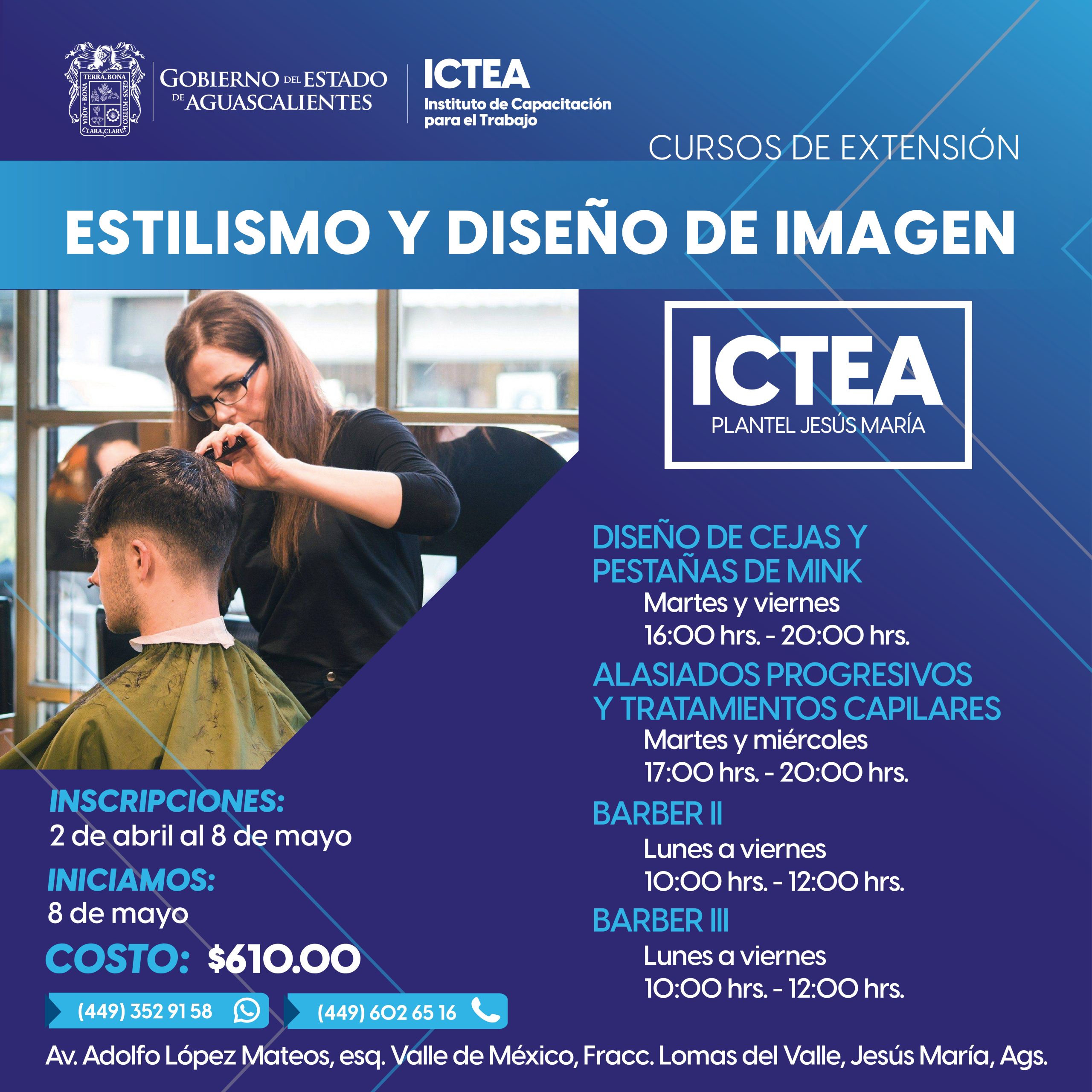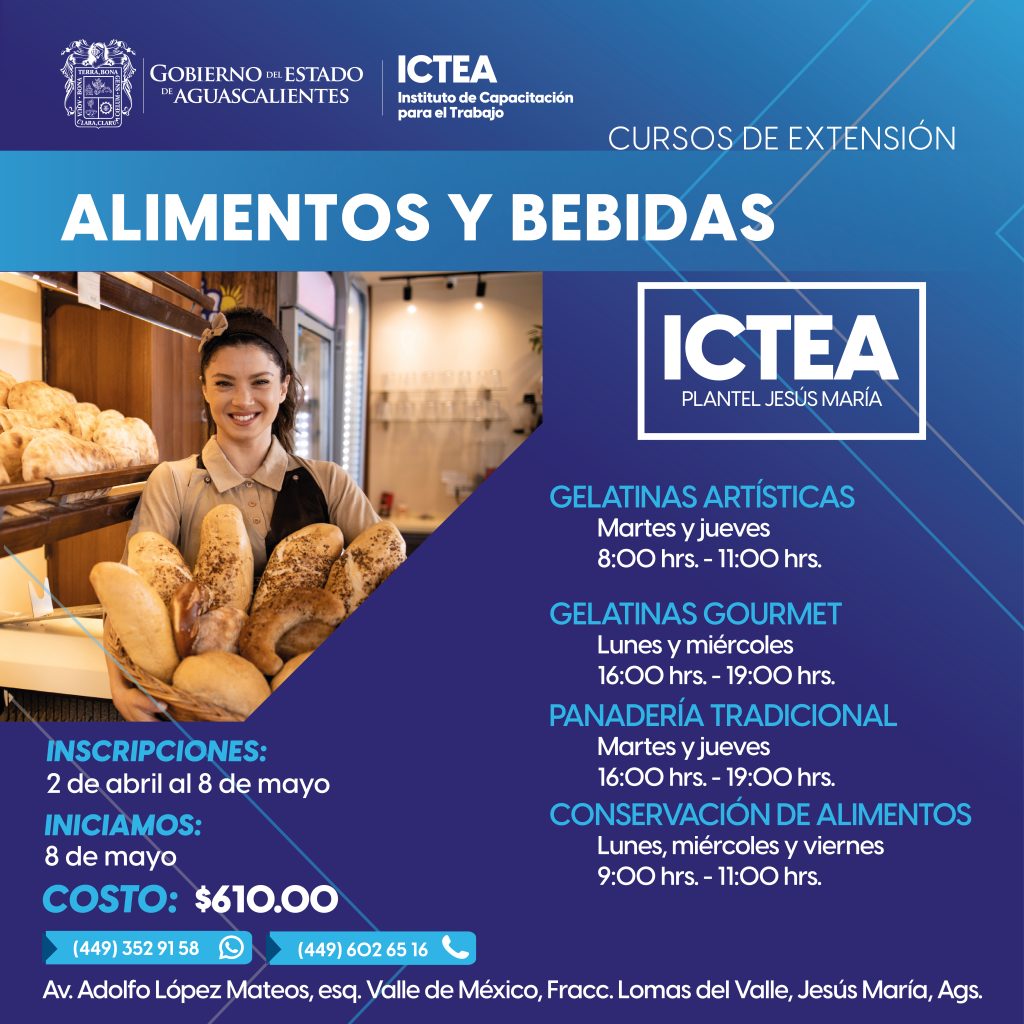 El Instituto de Capacitación para el Trabajo del Estado de Aguascalientes (ICTEA) te invita a participar en los diferentes cursos que imparte como: gastronomía, corte y confección; cosmetología y belleza; asistencia ejecutiva e informática; inglés, francés, japonés y alemán; electricidad, electrónica, máquinas-herramientas, mecánica automotriz, manejo de montacargas, refrigeración, aire acondicionado, carpintería y soldadura.