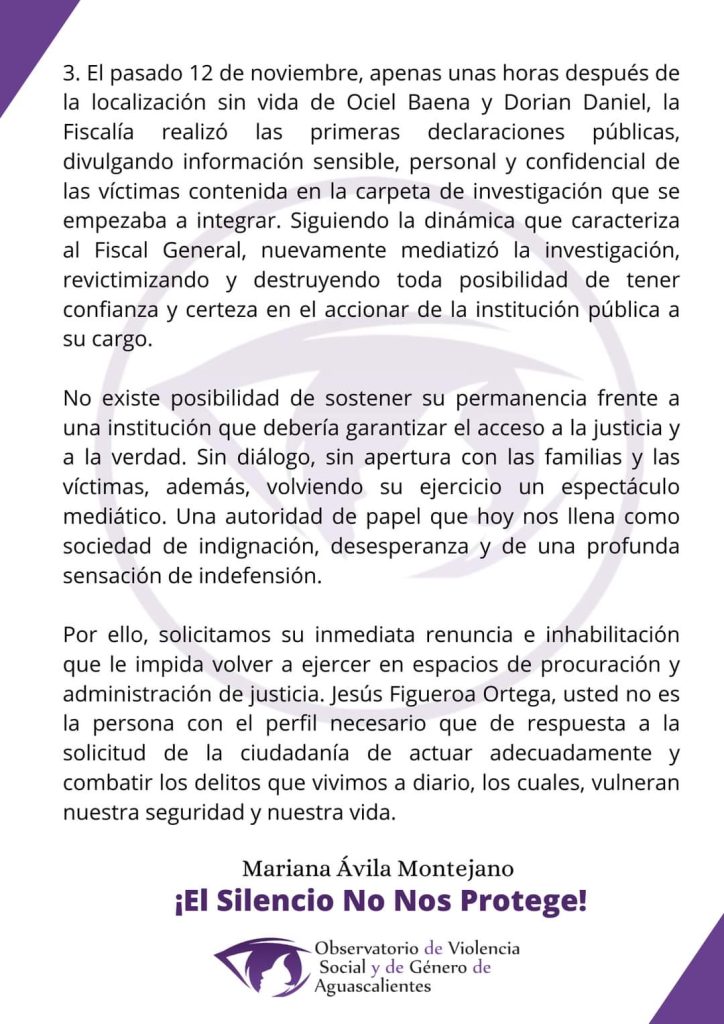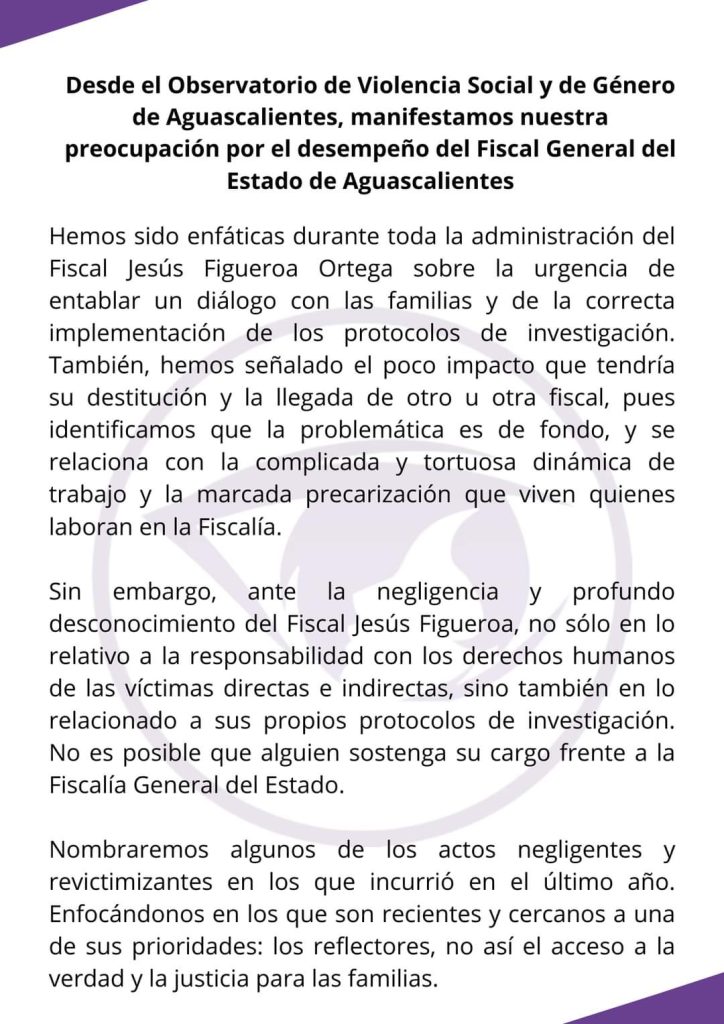 En un video y comunicado, el Observatorio de Violencia Social y de Género de Aguascalientes, en voz de su presidenta, Mariana Ávila Montejano lanzó la exigencia para que renuncie el Fiscal General del Estado de Aguascalientes, Jesús Figueroa Ortega, tras considerar que su trabajo es deficiente, negligente y con una profunda insensibilidad en la atención a Víctimas y familiares.