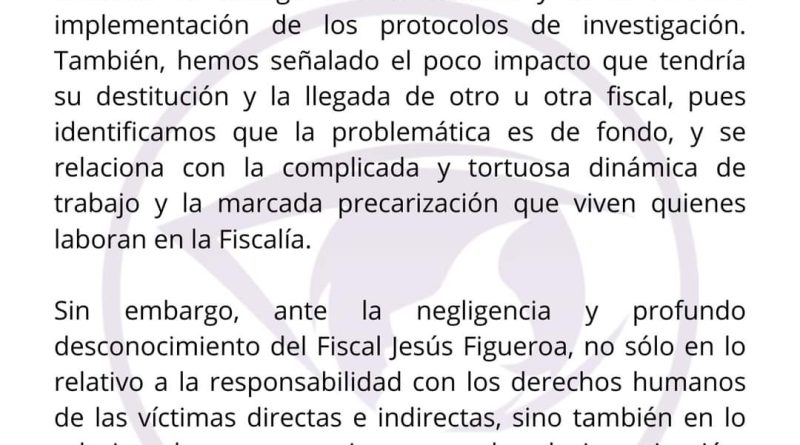 «No existe posibilidad de sostener su permanencia frente a una institución que debería garantizar el acceso a la justicia y a la verdad. Sin diálogo, sin apertura con las familias y las víctimas, además, volviendo su ejercicio, un espectáculo mediático. Una autoridad de papel que hoy nos llena como sociedad de indignación, desesperanza y de una profunda sensación de indefensión». Señaló.