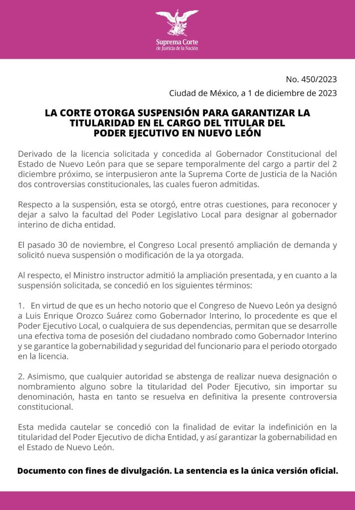 A unos minutos de que inicie la Licencia de Samuel García como gobernador de Nuevo León, en un comunicado de prensa la Suprema Corte de Justicia de la Nación (SCJN) informó sobre la suspensión que concedió en dos controversias constitucionales. En una de ellas dijo, se otorgó, entre otras cuestiones, para reconocer y dejar a salvo la facultad del Poder Legislativo Local para designar al gobernador interino de dicha entidad.