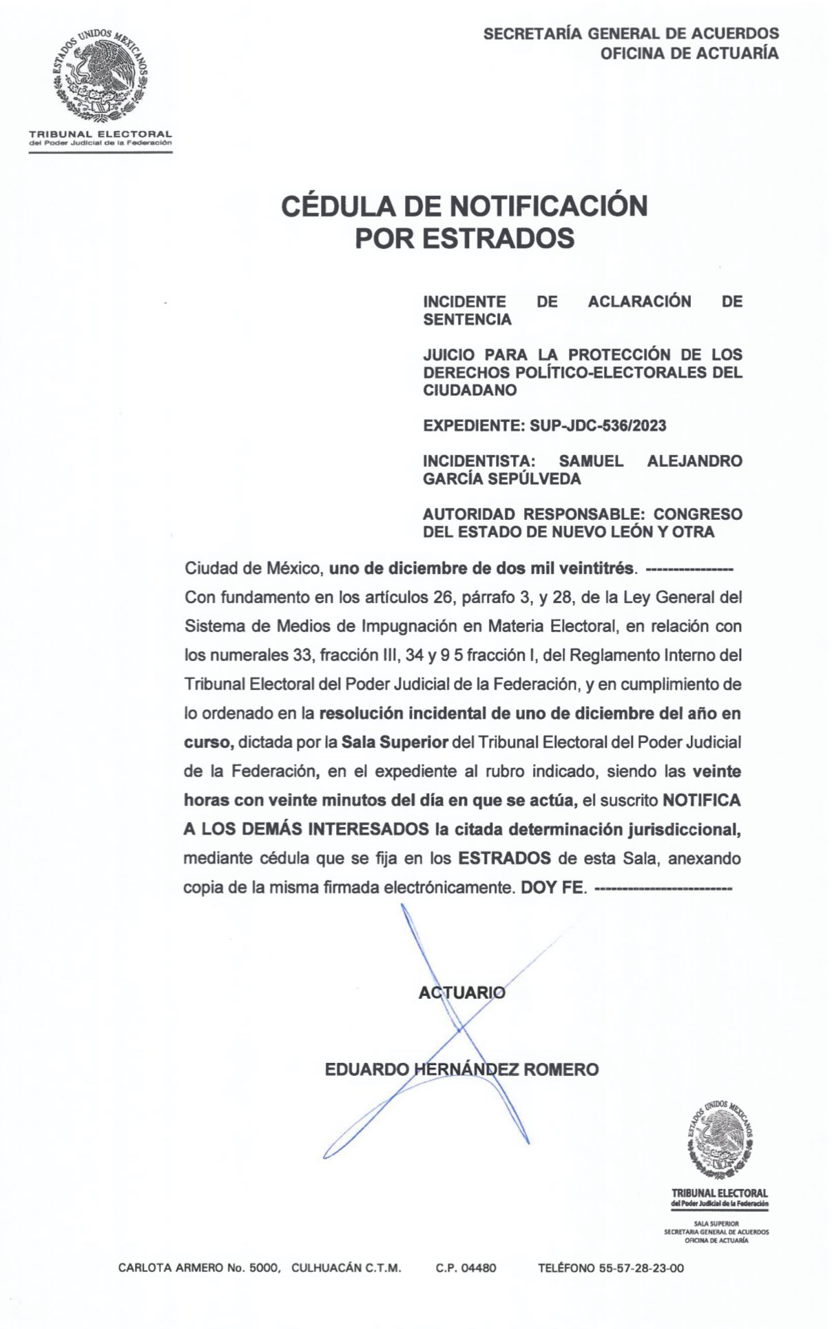Señala la cédula de notificación publicada esta noche en los estrados del Tribunal Electoral del Poder Judicial de la Federación #TEPJF.