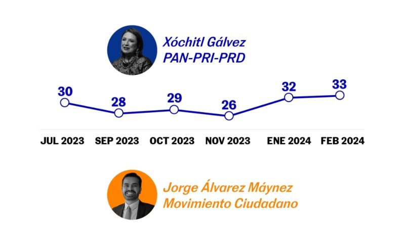 Con todo, será difícil descabalgar a Claudia Sheinbaum, cuyas calificaciones son inmejorables por ahora: su paso por el gobierno de la capital y sus muchos viajes de precampaña la han hecho bien conocida (84%), mientras su contrincante se ha tenido que ganar a pulso esa carrera. Gálvez ha subido 41 puntos en este aspecto desde julio de 2023. También le ha costado sus buenos recorridos por todo el país. Sin embargo, la opinión que de ella se ha hecho el electorado no acaba de despegar, incluso ha bajado 3 puntos en simpatía política en ese mismo periodo, quedándose en un 39%. Sheinbaum también se ha desgastado un poco, pero conserva un 66%. No es de extrañar, pues, que un 63% de los encuestados manifieste por ella una preferencia efectiva de voto, frente al 33% de Gálvez. 30 puntos pueden limarse en la campaña electoral, y en eso confían los seguidores del PAN, PRI y PRD, que irán coaligados a la elección bajo el nombre de Xóchitl Gálvez. Pero no será fácil dar la vuelta por completo a un resultado previsible.