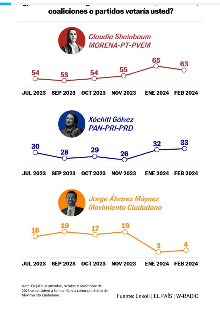 ENCUESTA DE ENKOLL DA 30 PUNTOS DE VENTAJA A CLAUDIA SHEINBAUM SOBRE XÓCHITL GÁLVEZ AL INICIO DE CAMPAÑA