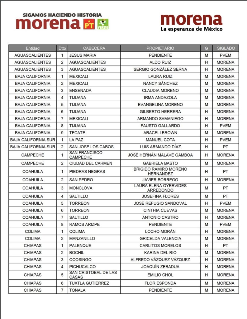 El comunicado señala qu e después de un exhaustivo análisis político, estadístico, la aplicación de un proceso de encuestas y definiciones de estrategia electoral para lograr la mayoría calificada en las Cámaras del Congreso de la Unión y concretar el Plan C, se presentan las y los candidatos preseleccionados para competir por los 300 distritos de mayoría relativa de la Coalición Sigamos Haciendo Historia y MORENA, respectivamente.