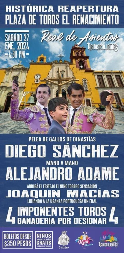 No te pierdas la reapertura de la histórica Plaza de Toros “El Renacimiento” como parte de las celebraciones de la Feria Regional de Real de Asientos, con la presentación de Diego Sánchez, Alejandro Adame y Joaquín Macías.