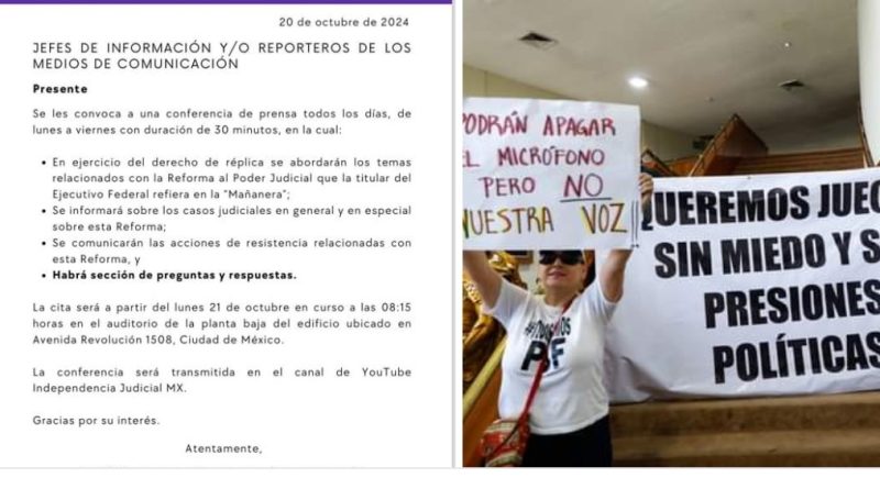 Jueces y Magistrados federales convocaron a partir del 21 de octubre, a sus conferencias de prensa que se realizarán de lunes a viernes, en la qur buscan presentar «información real» sobre el Poder Judicial y responder a los temas que la presidenta Claudia Sheinbaum mencione en sus conferencias matutinas.