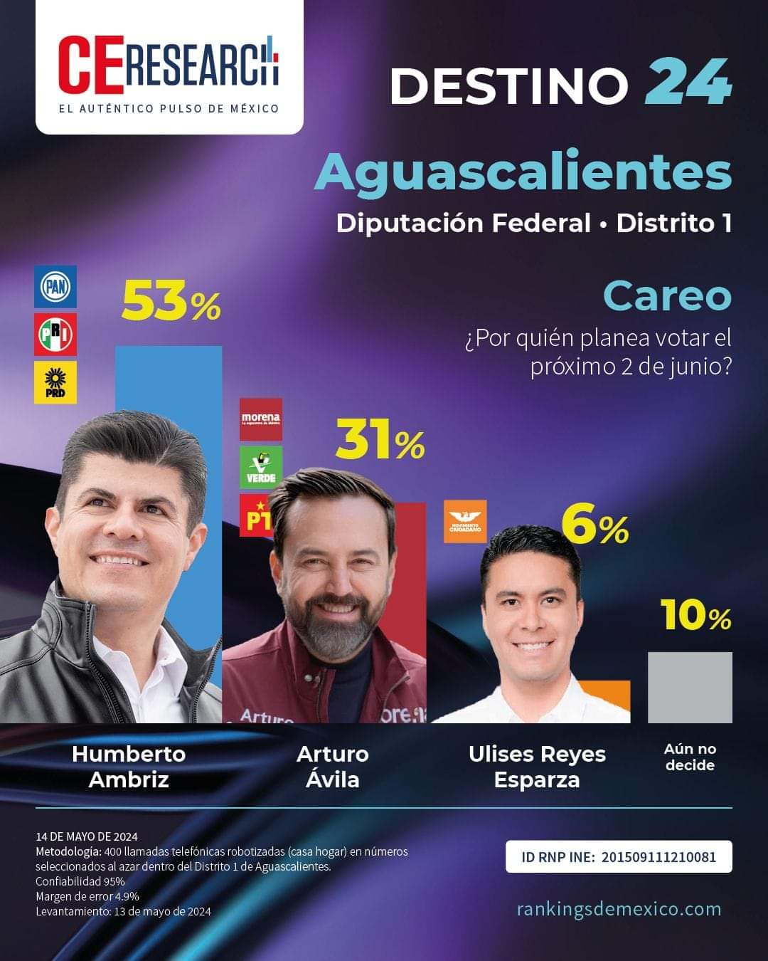 Humberto Ambriz, candidato a Diputado Federal por el distrito 1 se coloca como puntero en las preferencias electorales de acuerdo a la encuesta publicada por CEResearch este 14 de mayo, donde el representante de la coalición PAN- PRI- PRD obtuvo el 53 por ciento de la votación.