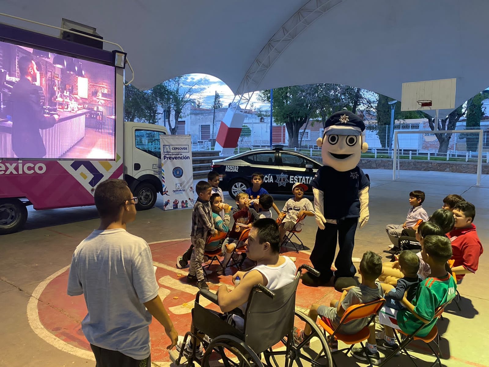 A fin de acercar a los menores y sus familias a las acciones de prevención que promueve la Secretaría de Seguridad Pública del Estado, (SSPA) se llevó el Cine Camión al municipio de Pabellón de Arteaga, en donde se dio una plática a los 150 asistentes para fortalecer el tejido social, crear lazos vecinales y aproximación de sus habitantes con los agentes policiacos.