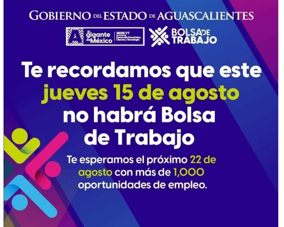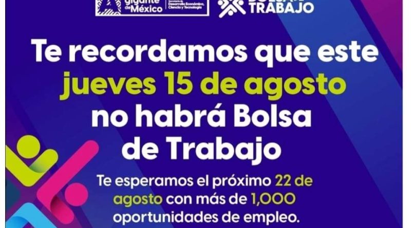 El Gobierno del Estado, a través del Servicio Estatal y Nacional de Empleo (SNEA), informa que con motivo de los festejos del Quincenario de la Virgen de la Asunción, este 15 de agosto no habrá Jueves de Bolsa de Trabajo.