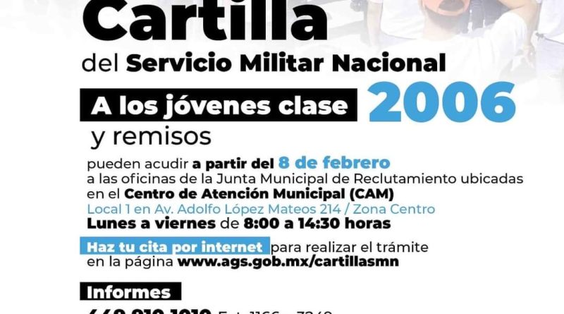 La Junta Municipal de Reclutamiento del Ayuntamiento de Aguascalientes reitera el llamado a todos los jóvenes nacidos en el año 2006 y remisos, a que se acerquen a realizar el trámite de la Cartilla del Servicio Militar Nacional.