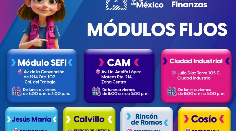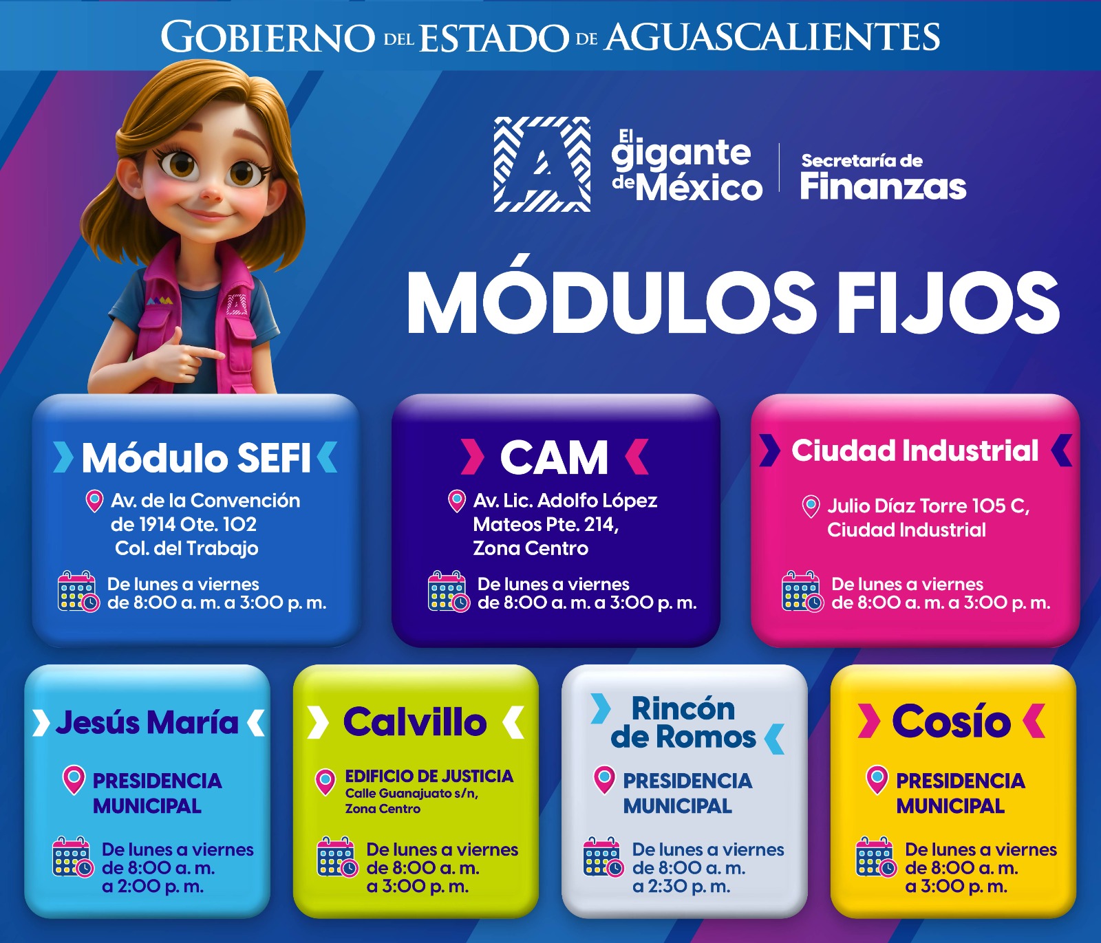 Para que puedas hacer tus trámites de forma más rápida y sencilla, la Secretaría de Finanzas del Estado (SEFI) pone a tu disposición siete módulos fijos de atención en la ciudad de Aguascalientes y en algunos municipios.