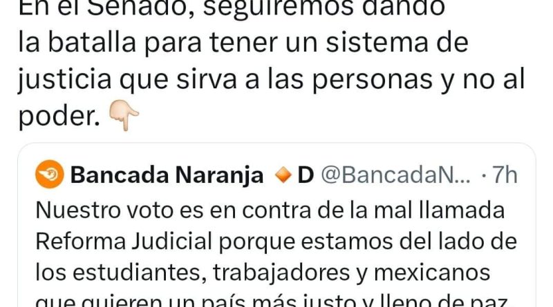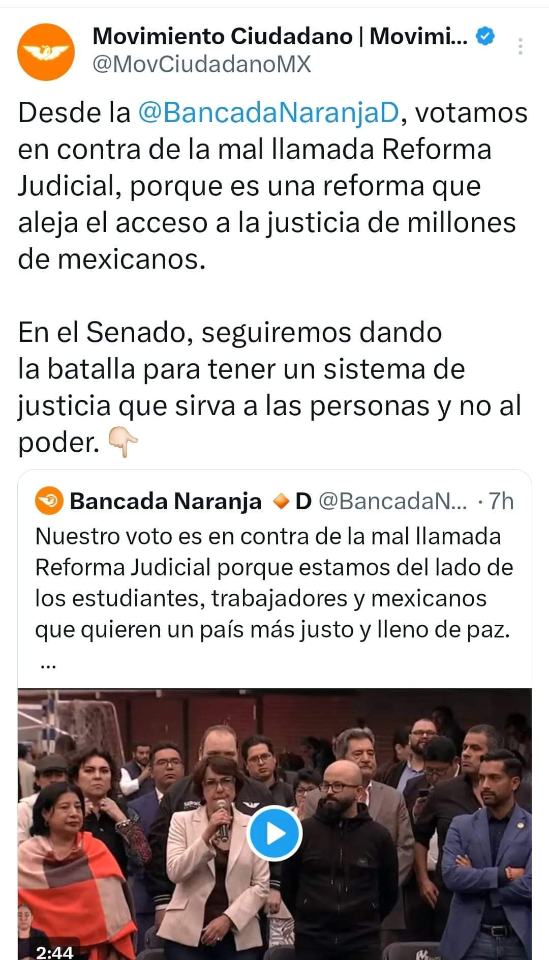 *»Desde la @BancadaNaranjaD, votamos en contra de la mal llamada Reforma Judicial, porque es una reforma que aleja el acceso a la justicia de millones de mexicanos».MC