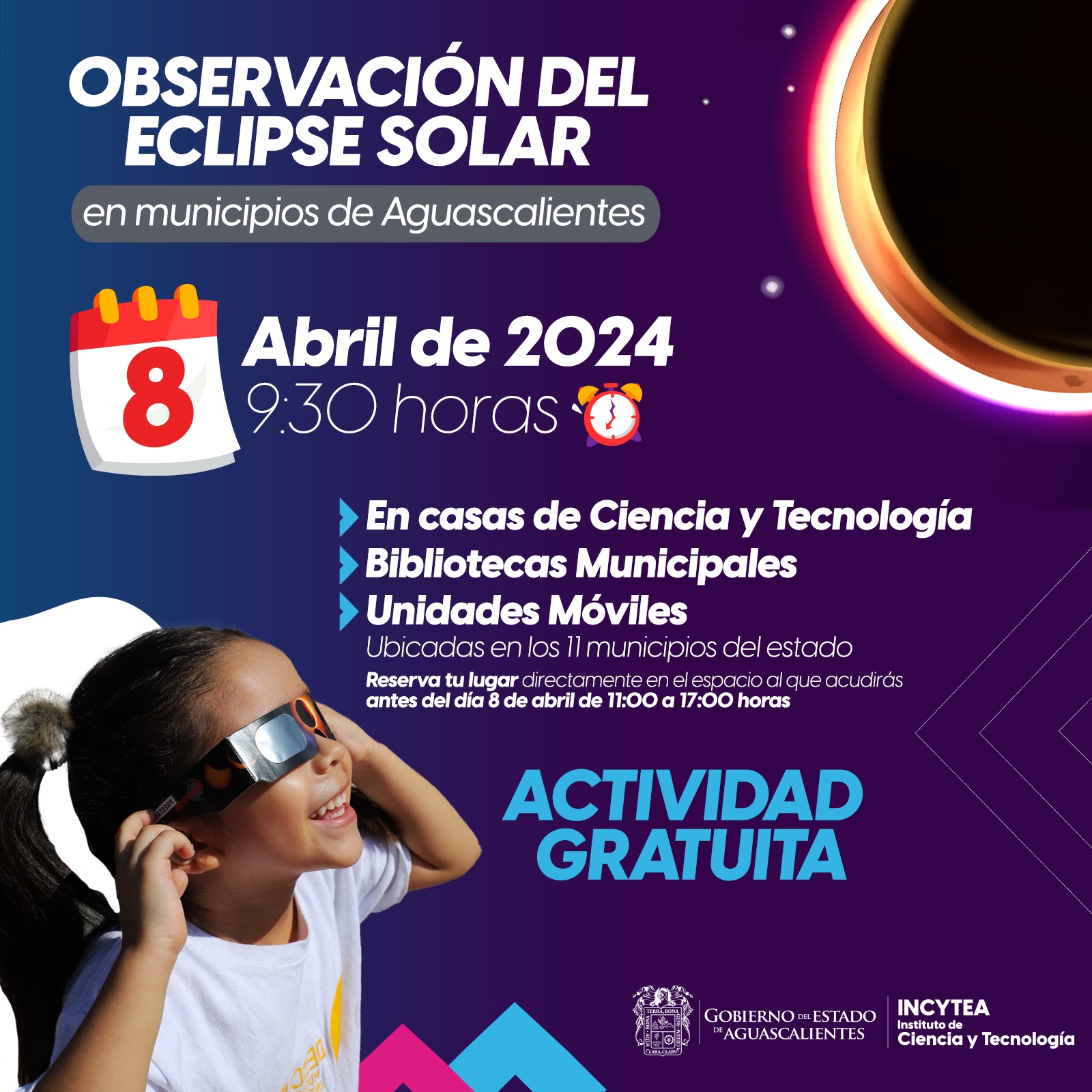 El Instituto de Ciencia y Tecnología del Estado (Incytea) invita a las y los habitantes de los 11 municipios de Aguascalientes a participar en las diferentes actividades que se realizarán el próximo 8 de abril a partir de las 9:30 horas, con motivo del eclipse solar.