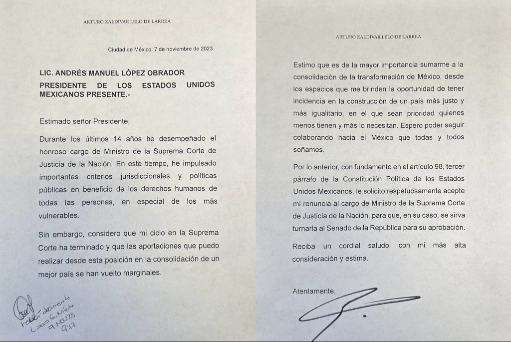 RENUNCIA MINISTRO ARTURO ZALDÍVAR EX PRESIDENTE DE LA SUPREMA CORTE DE JUSTICIA DE LA NACIÓN (SCJN)