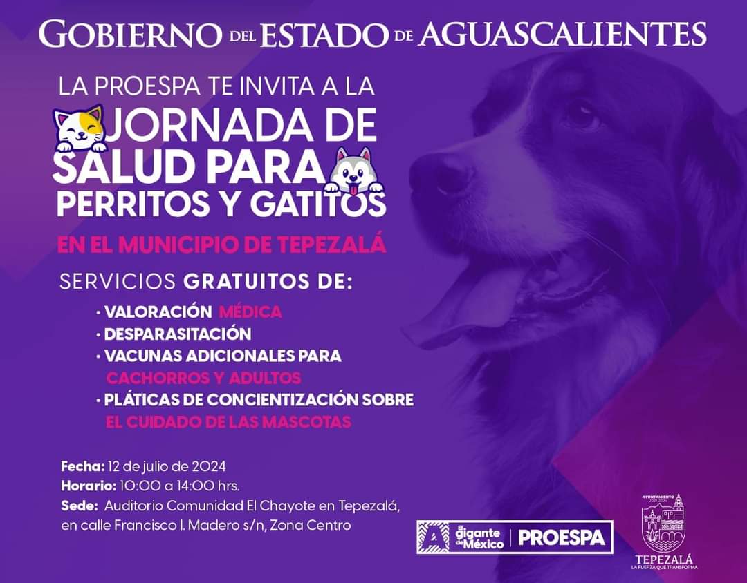 El Gobierno del Estado invita a la población a acudir a la Jornada de Salud para Perritos y Gatitos que se llevará a cabo en la comunidad El Chayote, en el municipio de Tepezalá, este viernes 12 de julio.