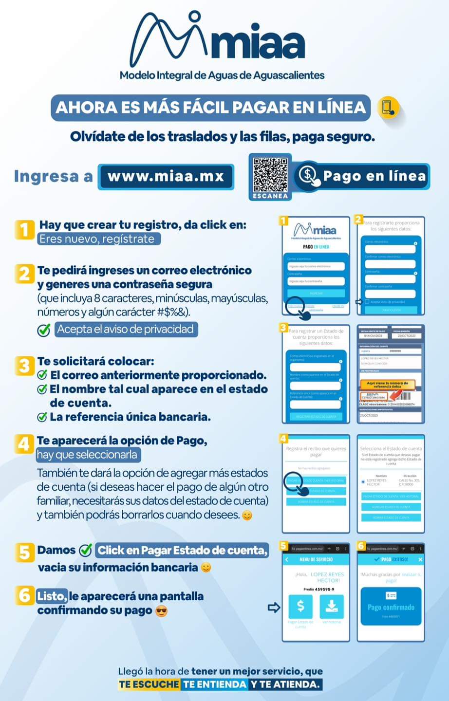 Desde la comodidad de su celular o computadora, es posible acceder a la página web www.miaa.mx y mediante un registro previo, se podrá efectuar el pago de manera rápida y segura.