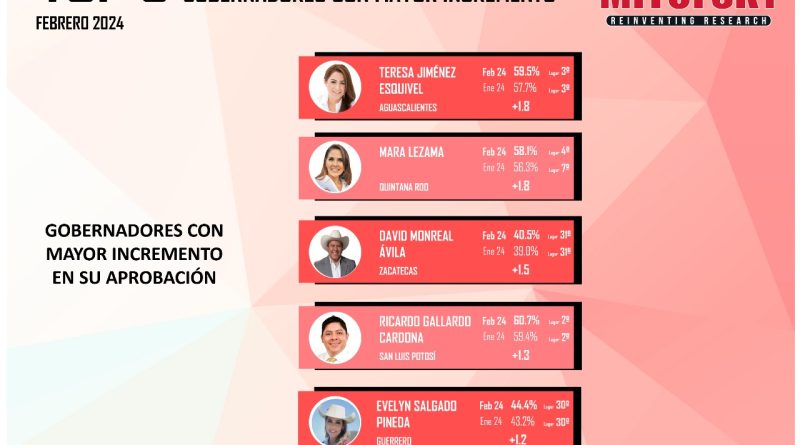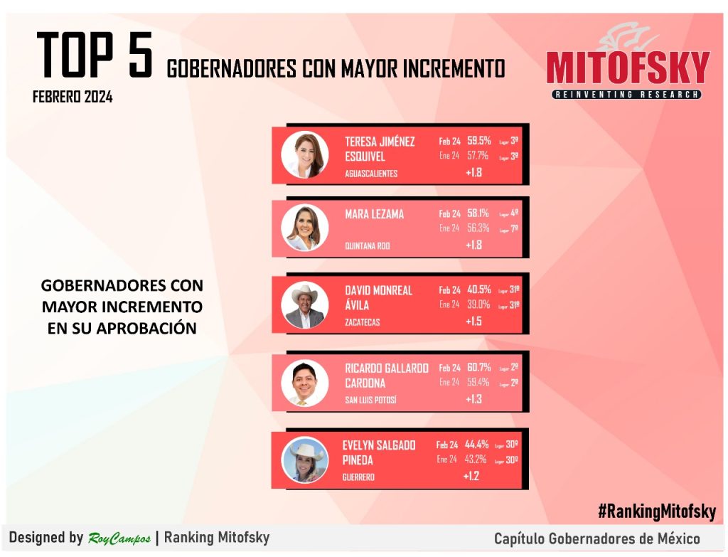 La noche de este viernes Roy Campos Director de Consulta Mitopsky dio a conocer los resultados de un sondeos realizado entre los meses de enero y febrero, en donde se medio el incremento de la popularidad de los gobernadores, resultando que Tere Jiménez Gobernadora de Aguascalientes es la que más ha incremento su popularidad entre sus gobernados.