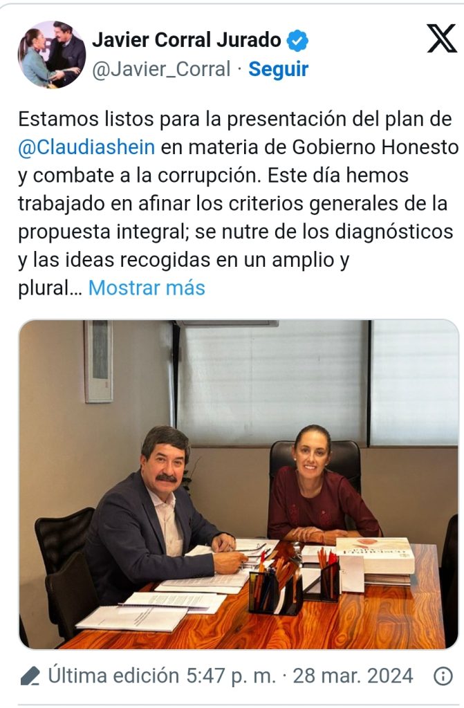 La reunión culminó con la confirmación de la presentación oficial del plan el próximo 1 de abril. «Estamos preparados para dar a conocer el plan de @Claudiashein en materia de Gobierno Honesto y combate a la corrupción», expresó Corral en sus redes sociales, resaltando la integralidad de la propuesta, la cual se ha nutrido de diagnósticos y sugerencias recopiladas en un amplio y diverso ejercicio de diálogo por la transformación del país.
